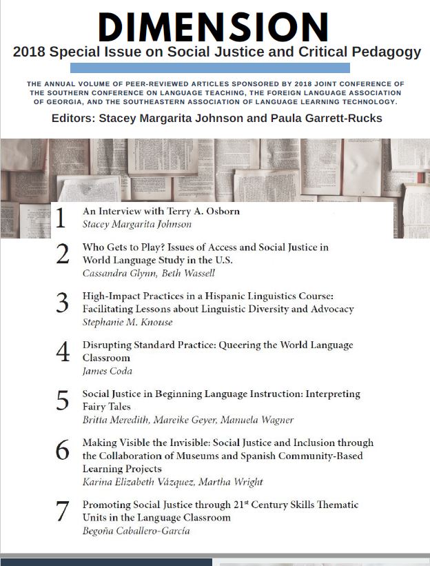 Britta Meredith (PhD candidate), Mareike Geyer (M.A. candidate, ALDS) and Prof. Manuela Wagner just published their article on “Social Justice in Beginning Language Instruction: Interpreting Fairy Tales” in the DIMENSION Special Issue for 2018: Focus on Social Justice and Critical Pedagogy.