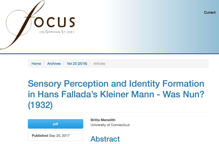 Britta Meredith, Ph.D. candidate in German Studies, just published her article on sensory perception in one of Hans Fallada’s most famous novels in Volume 23 of the scholarly journal Focus on German Studies. Congratulations!