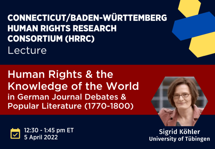 Organized by the Connecticut/Baden-Württemberg Human Rights Consortium (HRRC) and co-sponsored by the Human Rights Institute, the University of Connecticut Humanities Institute, University of Connecticut Global Affairs, and the Baden-Württemberg Ministry of Science, Research and Art, and the German Studies Colloquium, Prof. Köhler, Chair of German Literature at the University of Tübingen in Gremany will present two talks: