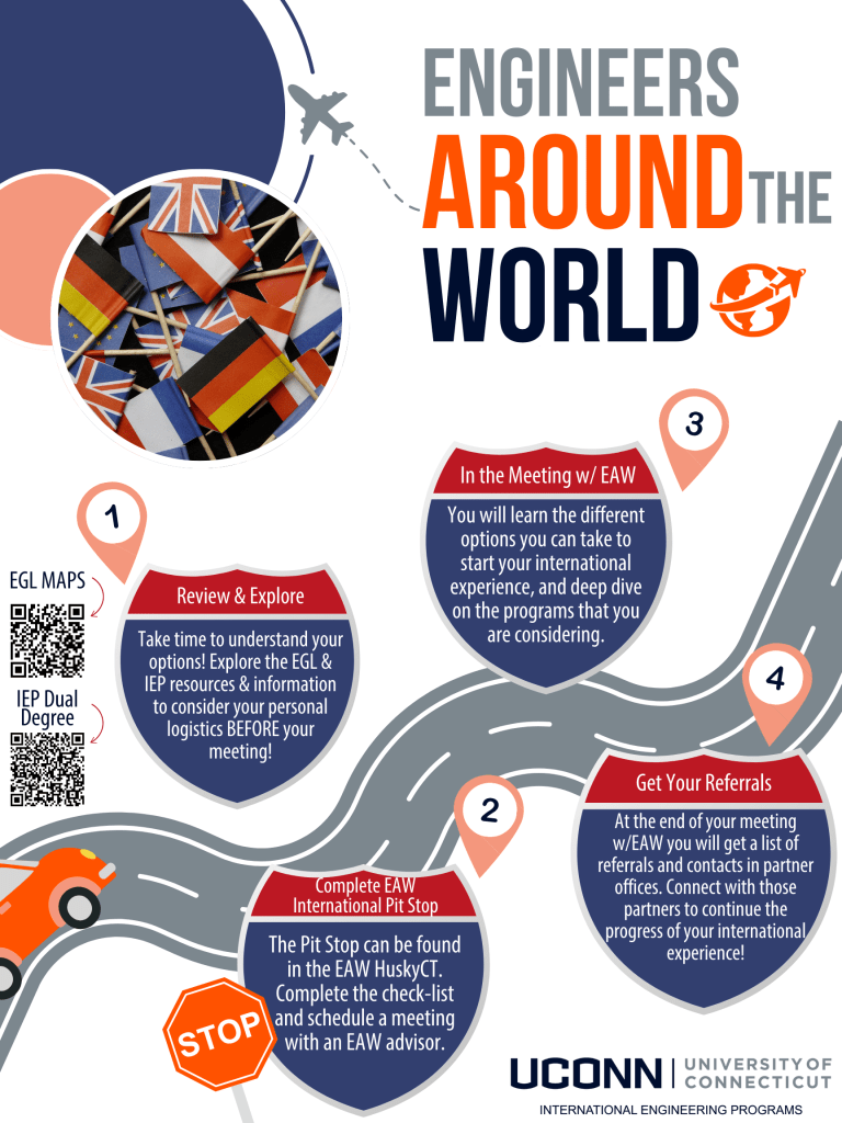 Participating in this program provides information and resources to all College of Engineering students interested in participating in an international experience. Whether it is through one of the 5-year, dual degree programs, a semester abroad/exchange trip, or a short-term international experience, EAW allows students to connect with advisors, faculty and personnel to help make the most informed, best decision on a personal level. By participating in the program through meetings with these resources through use of the EAW Road Map, students have the potential to receive scholarship funding to help subsidize the cost of studying abroad. Additionally, participating students in EAW are also eligible for other EAW prizes (e.g. merch, swag).
