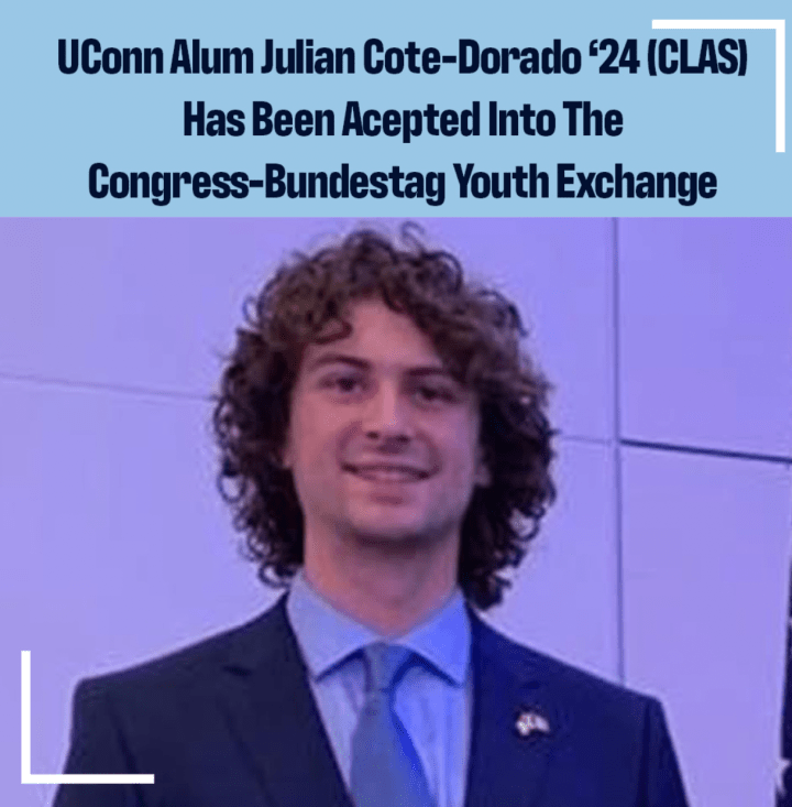 Julian Cote-Dorado, who majored in Political Science with German Studies and Economics minors, has been accepted into the Congress-Bundestag Youth Exchange (CBYX) for Young Professionals for the 2025-26 academic year. Here’s an excerpt from the UConn Today story released on June 3rd, 2025: