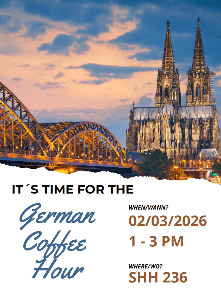 First Kaffeestunde of the Spring 2026 Semester Tuesday 2/3 January 30, 2026 By akfinger Share this: Share on X (Opens in new window) X Share on Facebook (Opens in new window) Facebook Like Loading... Related