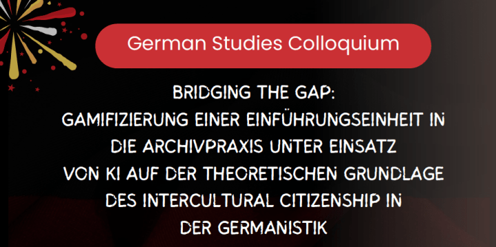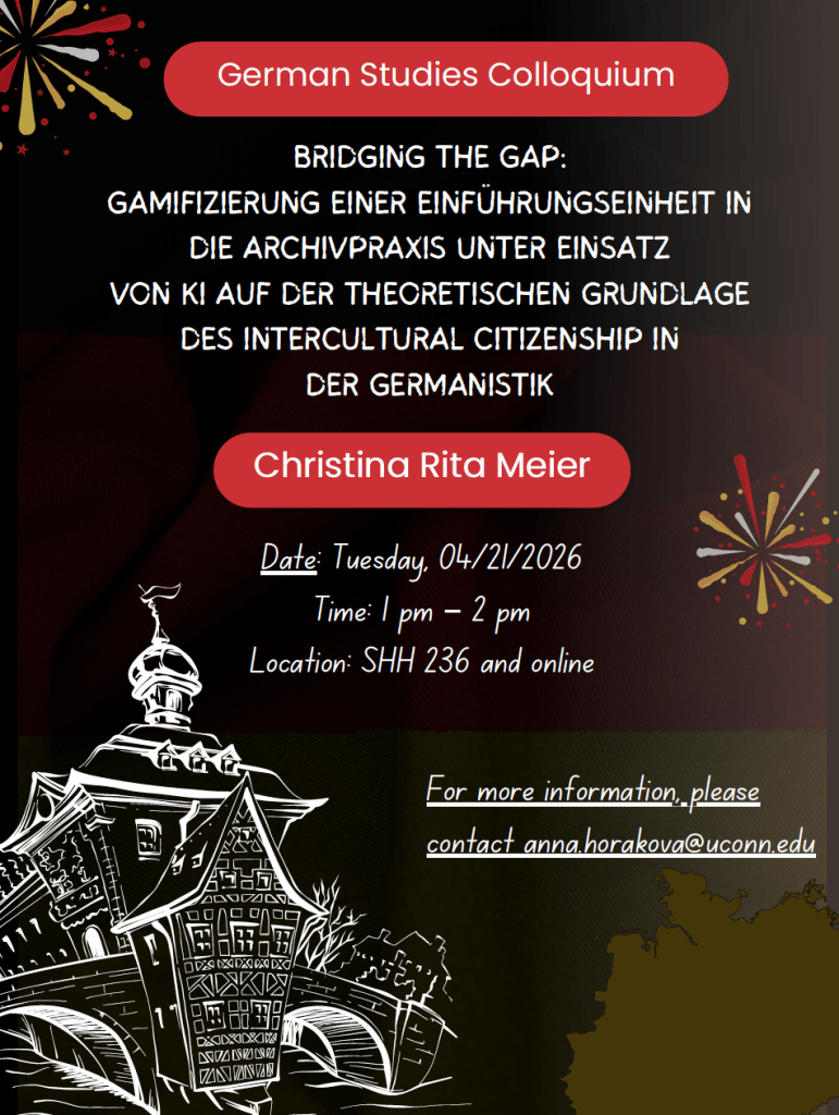 The colloquium, titled “Bridging the Gap: Gamifizierung einer Einführungseinheit in die Archivpraxis unter Einsatz von KI auf der theoretischen Grundlage des Intercultural Citizenship in der Germanistik,” will take place on Tuesday, April 21, from 1:00-2:00 pm in SHH 236, with a Zoom option available for UConn faculty who are unable to attend in person.