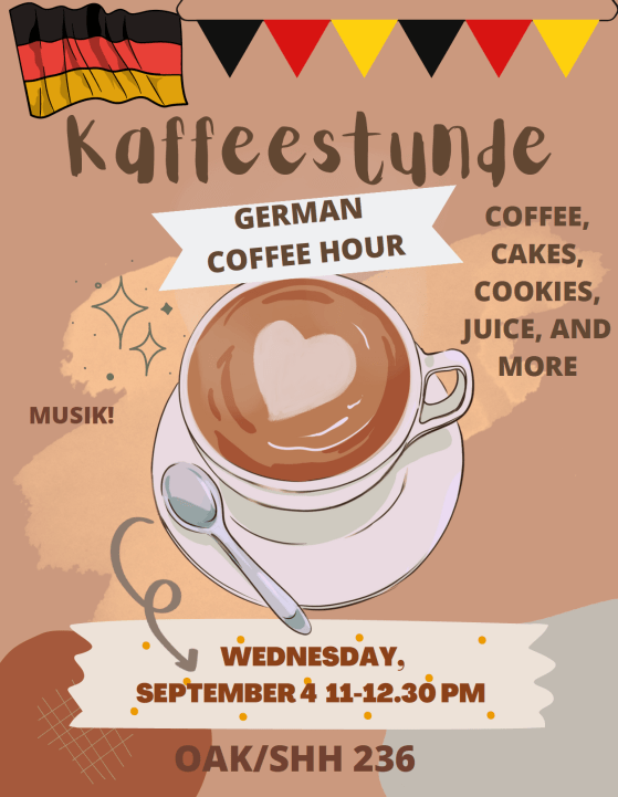 The German Studies Kaffeestunde is back! Join us for a monthly get-together, listen to music, practice some German, meet new people and enjoy Kaffee, Kekse und Kuchen!
